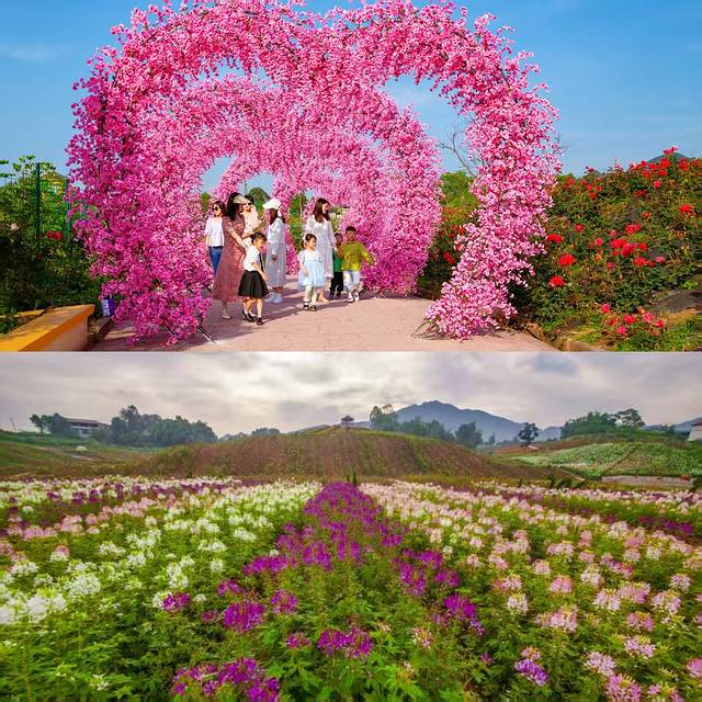 午后到百万玫瑰成长田园,花比想象中更盛。藤蔓架下的玫瑰垂成瀑布,路边的虞美人挺着单薄的花瓣,红的、白的、紫的,在风里轻轻晃。有穿着汉服的姑娘在花田里拍照,衣袂翻飞间,倒像是从画里走出来的。我们也学着摆姿势,笑声惊得蝴蝶扑棱棱飞起,停在不远处的花上。