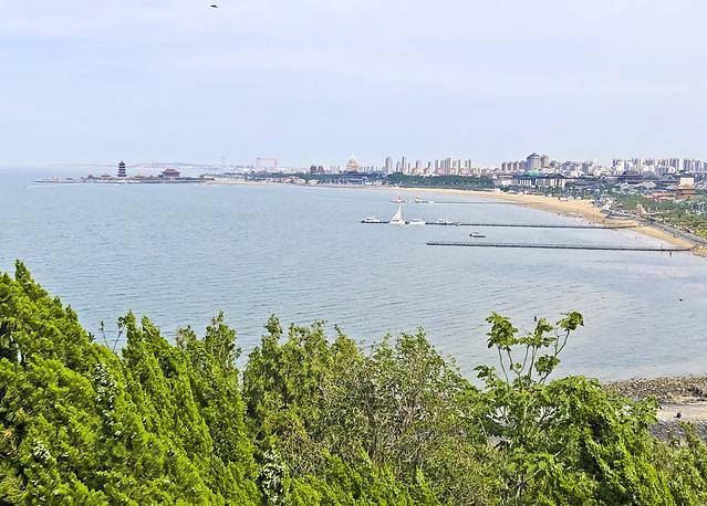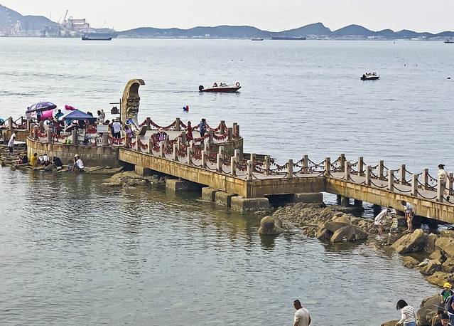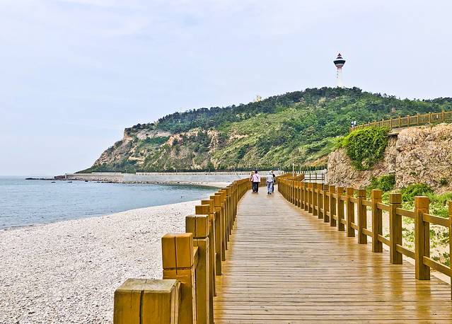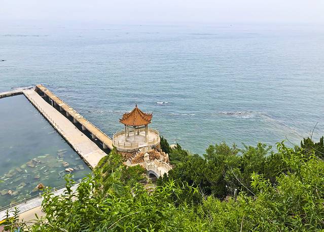 一路继续沿海岸向南走不远是栈桥,2005年进行重建,采用透明玻璃桥面设计,末端设有中国风格望海亭,整体较漂亮,好像晚上还有灯光。