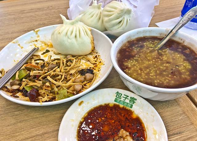 参观后找吃的,百度地图上有个“包子客”好像不错,转2个弯就到了,果然不错,白白的大包子有好几种馅,还有3元的粥随便喝,八宝粥、银耳粥、小米粥,还有两种浓汤,3元的小菜自己夹,真是太合我心了。要了2个牛肉的2个荠菜的,粥与小菜各来一份,吃得不要太舒服。最后剩下一个荠菜包当晚饭。