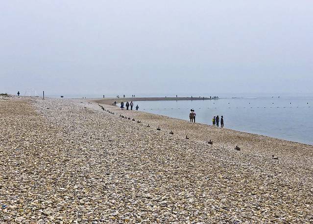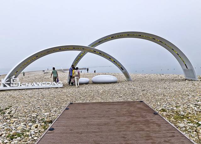 乘上电瓶车继续走就可来到分界线的海边,有长长的木栈道通向里面,我一直走到最里面,大雾影响不到画面了,拍了好多张两个海向中间冲的浪花,但不够理想,一是浪太小,二是总有人在玩儿,影响画面。