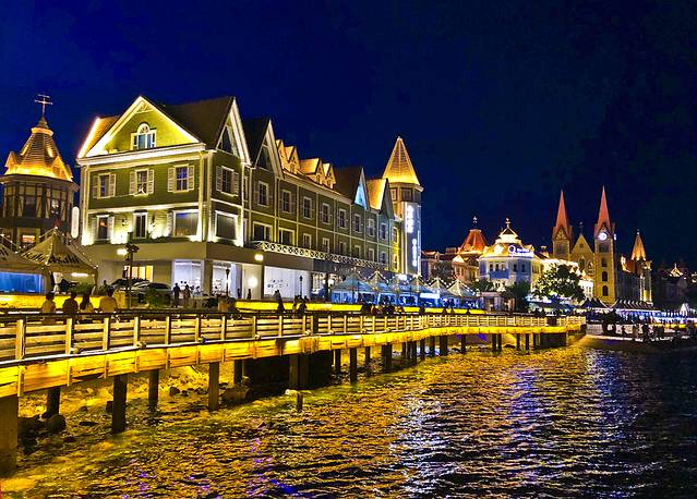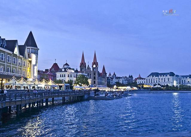 继续乘17路公交到渔人码头。先在里面走了走,环境不错,4A级旅游景区,三面环海。项目集合了旅游、餐饮、休闲、娱乐、购物、度假等多种元素。但我没有深入游览,走一下就到南岸的亲水码头附近喝着饮料闲坐。游人不少,吃东西的地方也多。可等到7:30没有开灯的意思,今天来此的目的就是欣赏这一片洋房灯光。后来在一个亭子里边听路人弹琵琶边等,眼睁睁等过了蓝调天空,8:00天空完全黑了后才亮灯,太可惜了。