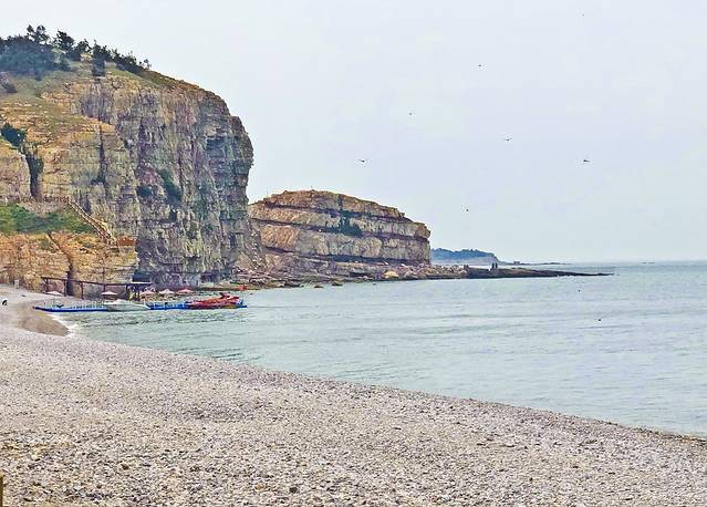 接着等游12路,很快就来了一辆,司机问我去哪儿,我说南北都行。此车是去九丈崖的,在长岛最北面,观落日的地方。海边有一片高耸的崖壁。有栈道可走一大圈。有点饿了,买了2包饼干和水,想找个地方边赏海边吃,可景区的苍蝇非常非常多,渔村养殖,总是有味道,会引来苍蝇。走到高处稍好些。
