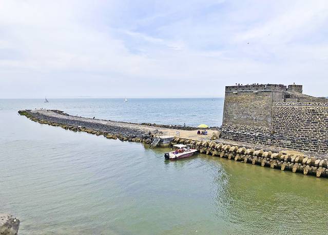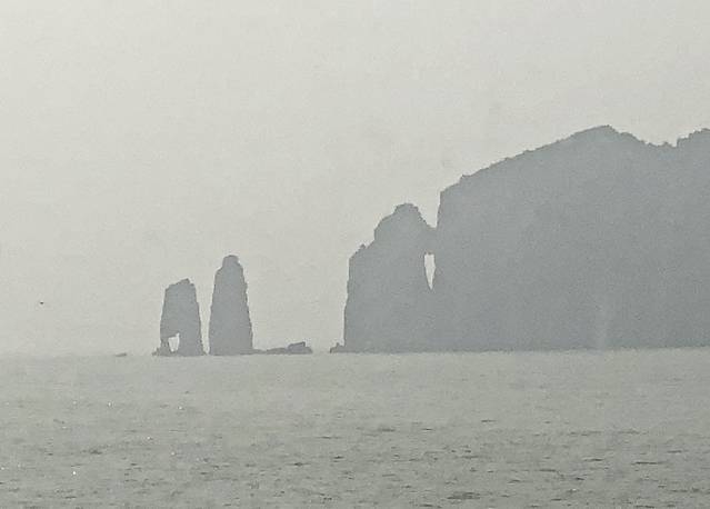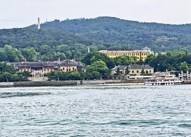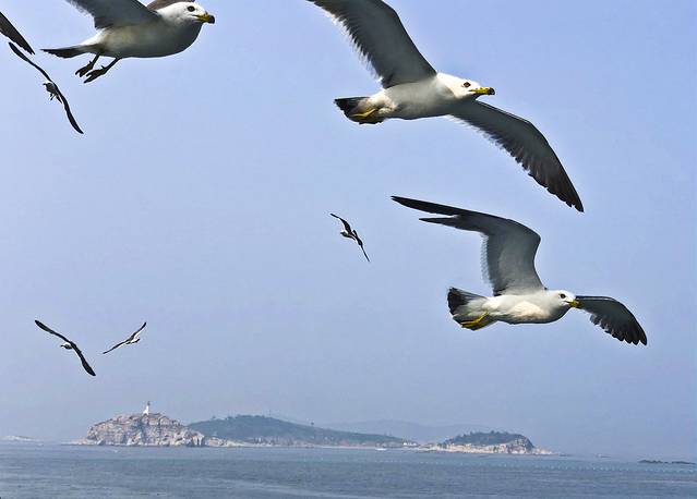 去刘公岛的游船很多,流水发,十几分钟就一斑,船票我是事先在网上买好的,船票加门票一体。刷身份证上那班船都可。40分钟航程很快就到了,今天晴但也是雾雾的,海水不蓝,不少海鸥围着游船飞翔。