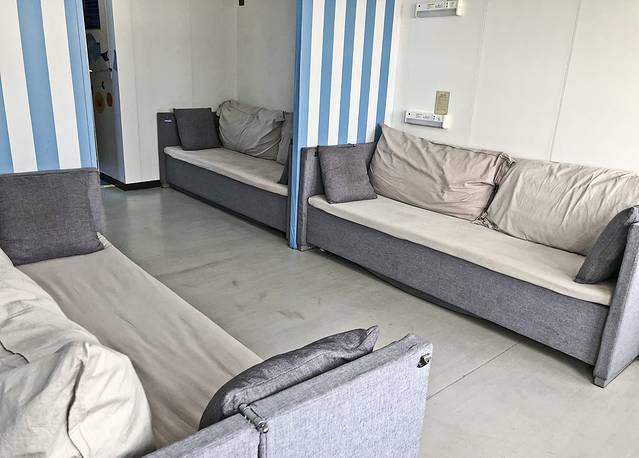 我位置旁边有几个沙发无人,开船后我便过来,4个小时基本都是躺着听小说。也各处走走看看,但雾大不好玩。其间路过了一个挺有形的小岛,雾大模糊。