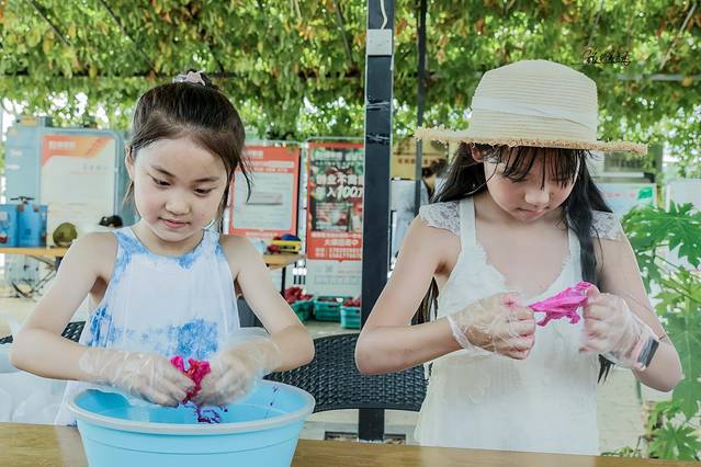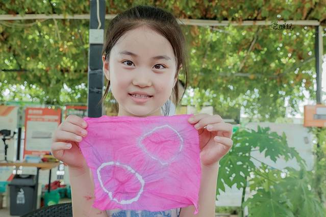 现场的手工扎染DIY更是趣味十足。用火龙果的果皮汁水当作天然染料,女儿发挥着自己的想象力,染出了一块漂亮的手帕。