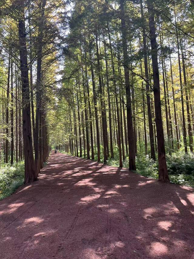 森林公园2号门进去后,第一站当然是网红杉树林,去的时候是上午十点左右,光线特别的好,拍照效果简直无敌,喜欢拍照的朋友可以多在此处停留打卡,门口的杉木林拍完照后,一定要网右手边的林子深处走,里面还有一条不扫落叶的林荫道,路面是红色的杉木叶子,特别漂亮,我们去的时候外面拍照的人很多,但是这条道基本上没人拍照,估计好多是因为没有看见,这条林荫道拍照效果巨好,打卡千万别错过了。