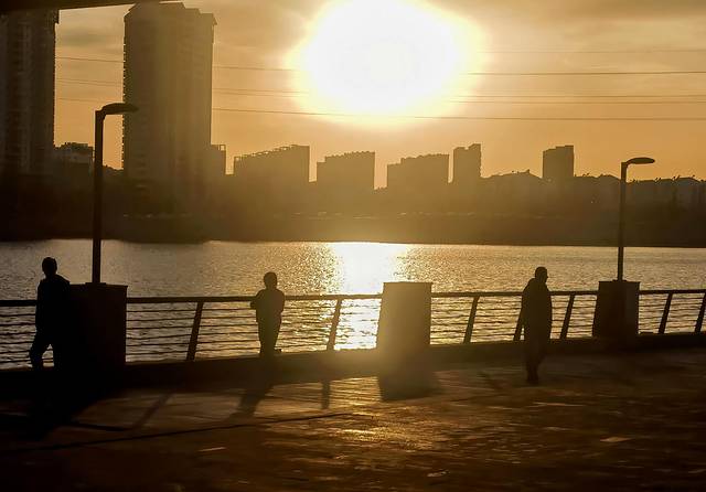 顺利回到锦州城区后,又打车去了古塔公园,然后从公园南门出,顺着路去往小凌河,傍晚的小凌河很舒服,散步的、锻炼的人很多,日落倒映在河水里,说不出的美,河边还有个大哥在钓鱼,肉眼可见鱼儿围着墩子在打转。