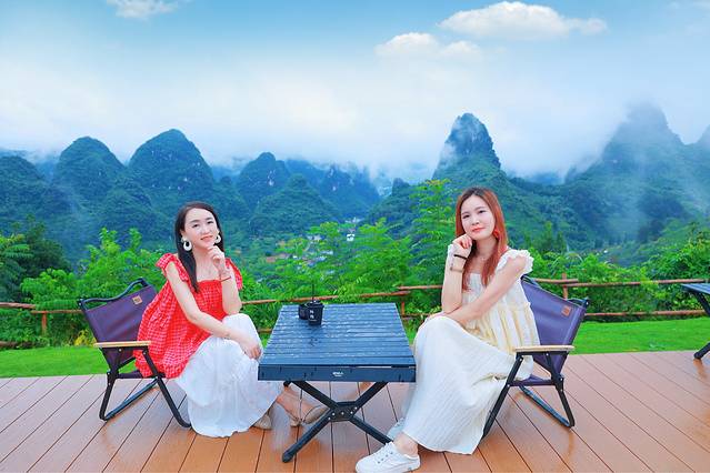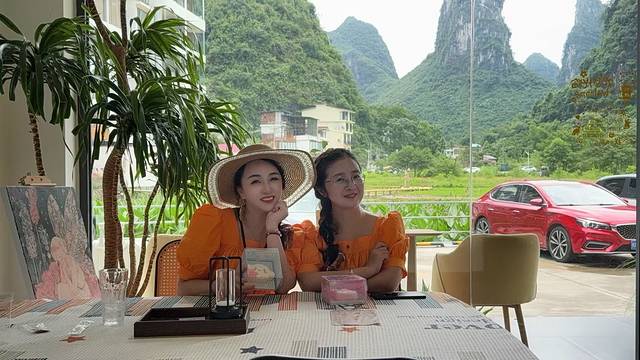 上午专程去相月庭咖啡厅,果然没让人失望。门口的露营椅正对着遇龙河,坐下拍张照,青山绿水当背景板,随手就是杂志大片。二楼的窗边位置视野更好,点杯冰美式,看竹筏从河面漂过,筏工的山歌远远传来,慢悠悠地拍了好多照片,手机内存告急也舍不得。