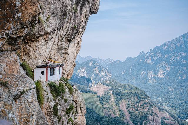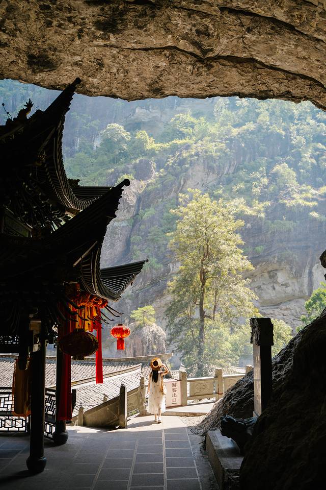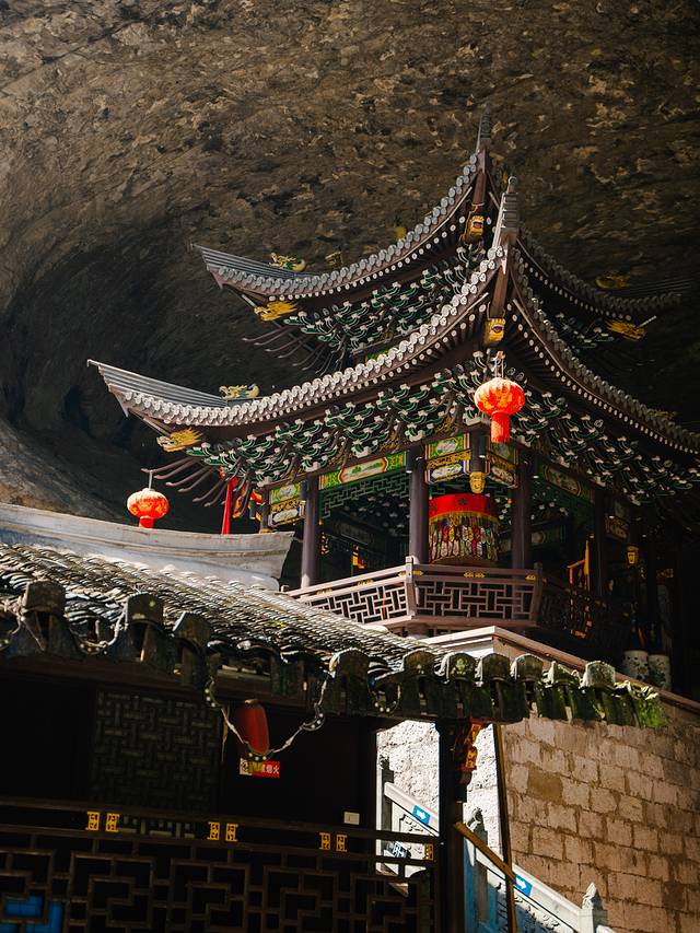 而这里还有个悬崖凹进去行程的山洞,里面修了一座小庙,可谓峻险,脚踏着栈道,头顶着压迫感十足的岩壁,绝对难忘!