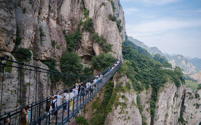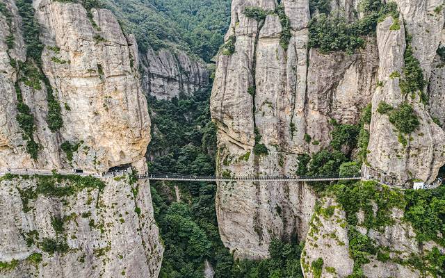 绝壁上架起了百余米的栈道,沿着栈道一路行走,一面是万丈深渊,一面是起伏的岩壁,凭栏俯瞰,一不小心就吓软了腿!