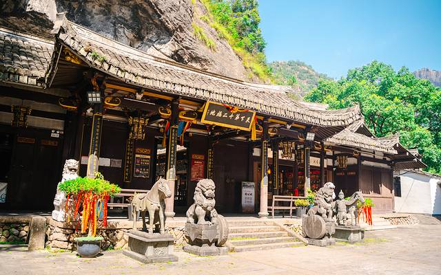 整个崖洞天然形成,洞内晦明,随云变幻,云归则暗,云散则明,高56米,宽76米,深79米,颇为壮观,是浙南最大的石室,洞内分为上下两层,下层建有三间观音阁,讲经坛可纳数百人。