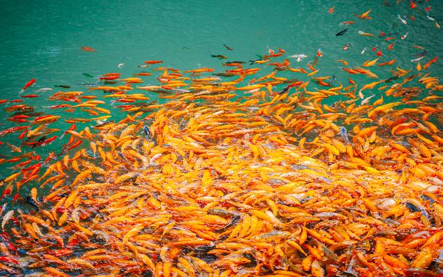 有意思的是带点鱼食瞬间就能吸引一大波锦鲤哦~
