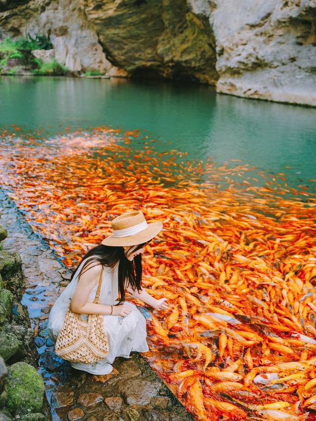 陶公洞外清凉的岩壁环抱中,有一条大大的放生河,池水映着洞口的天光,水质清澈见底,池里都是密密麻麻放生的鲤鱼,红白锦鲤悠然游弋,在澄澈碧水中自在穿梭,为古朴的石洞增添一抹鲜活的生机!