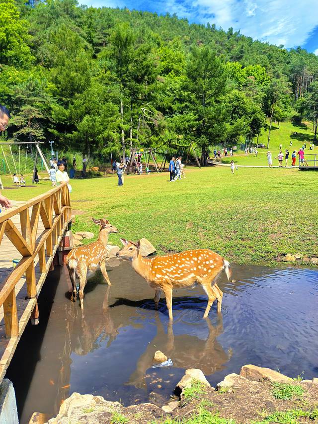 ➊ 溪水逗鹿:拎着鹿饼(10元/袋)刚进园,梅花鹿从森林窜出追着跑!光脚踩进冰凉小溪,小鹿蹭手心讨食萌化~