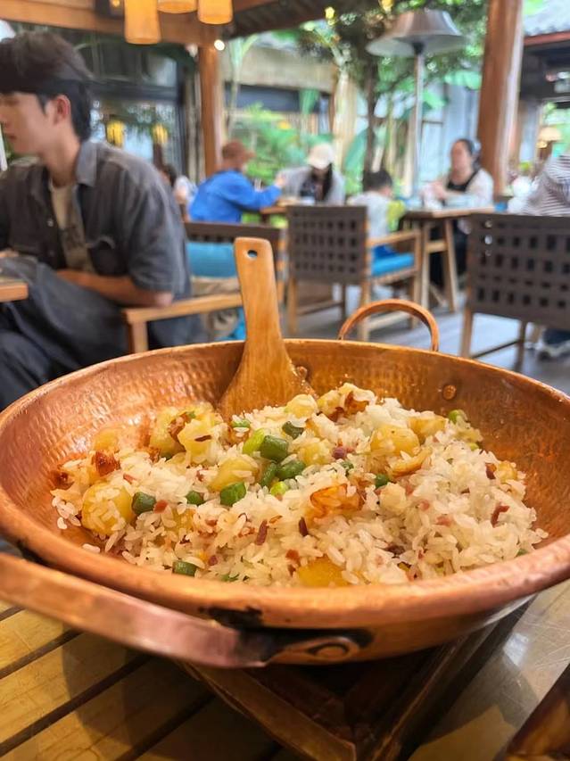 小锅饭现煮,有焦香小土豆,腊肉碎和豆子豆角,米饭比较有嚼劲。