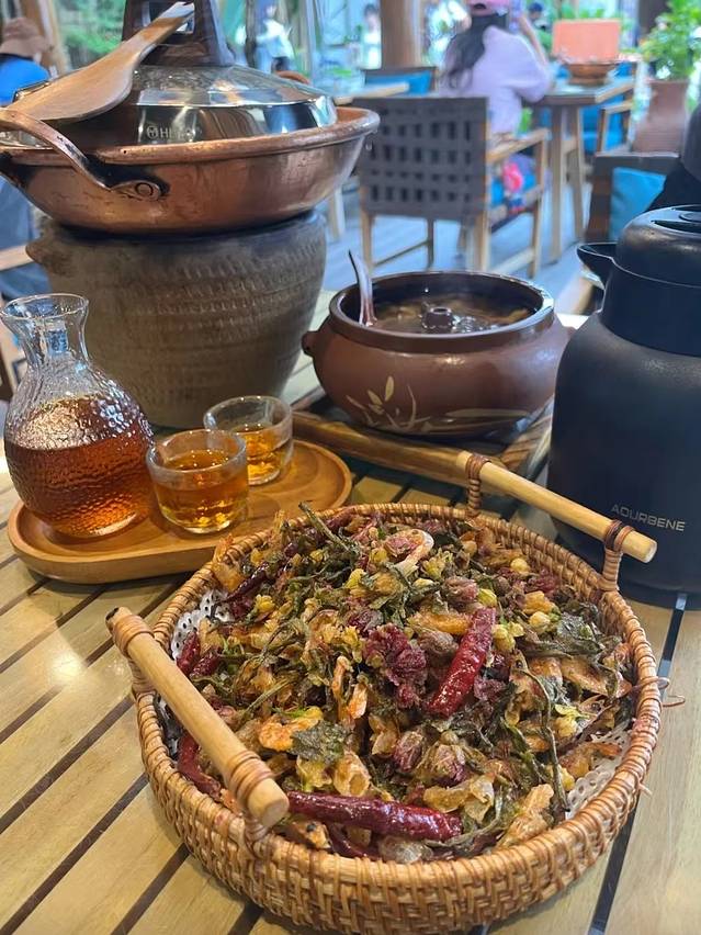 招牌菜点了小锅饭,普洱茶炒虾,野生菌鸡汤,还有普洱茶酒,酸角大王饮料。