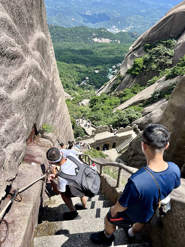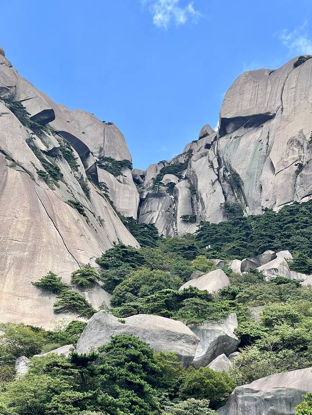 因为时间关系,开车到大龙窝做了索道,这样可以免去坐景交车,索道周围有6个停车场,每个都不太大,车位需要找一找的。索道之后从振衣岗往高奔台、神秘谷方向走,然后到天池峰、拜岳台,沿途都是花岗岩山石,又像在爬山又像在大石头间穿行。当天天气极好,走到石头下有风就很舒服。因为百步云梯只限下行,所以到了之后从古炮台、百步云梯下撤的,时间快了一倍,百步云梯大概能容纳2个人,几乎是笔直下来,下山总共用了30分钟左右。现在天柱山东关也开了,之间有康养步道,其实时间宽裕的话,从西关走到东关也是不错的选择。