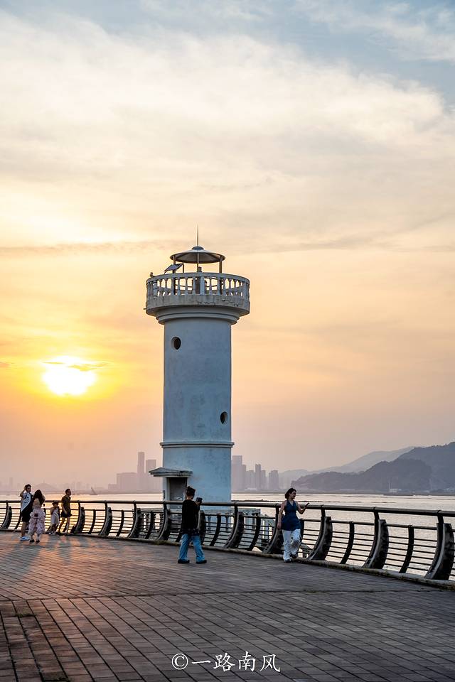 夕阳下,灯塔与瓯江两岸景色交相辉映,瑰丽、浪漫、梦幻。