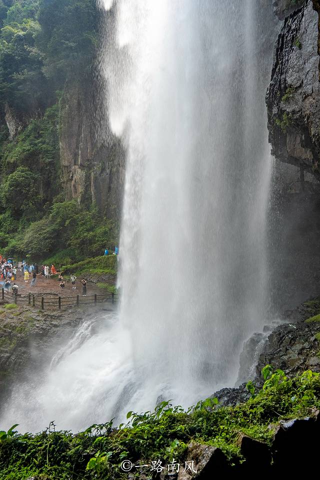 穿过第二漈瀑布是奇妙的体验,由于水雾较大且岩壁滴水密如下雨,需要穿雨衣快速通过。