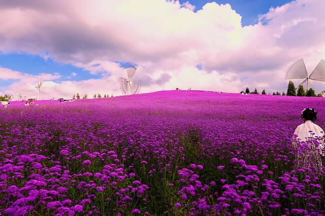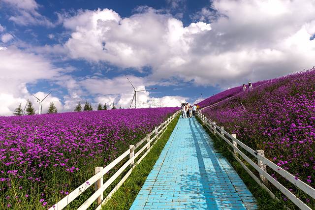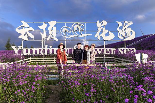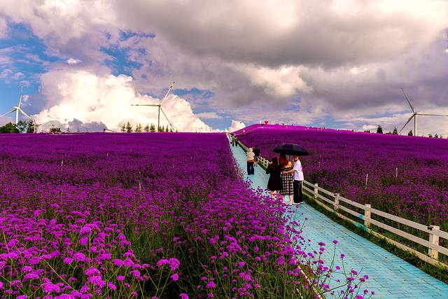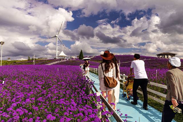 踏入云顶花海,一眼望去:花海绚烂绽放,连片的马鞭草如紫色丝毯绵延至天际,让人仿佛置身于不真实的梦幻般的画卷之中。