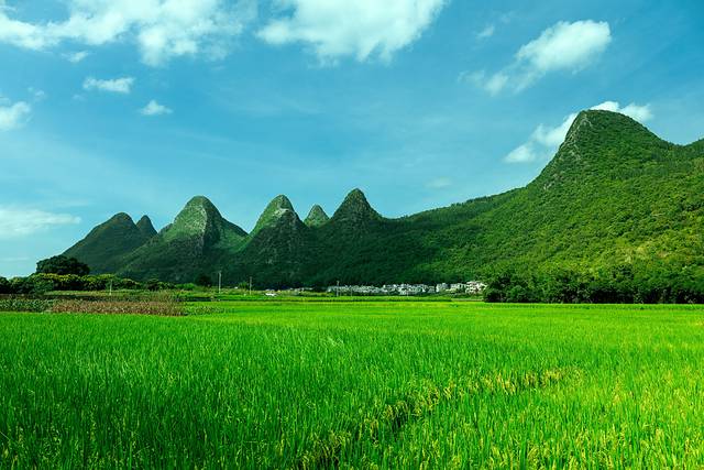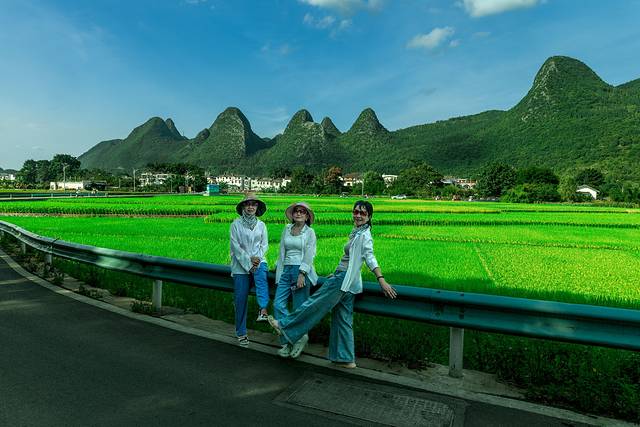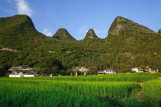 这是著名“六六大顺”峰。我当然是等到有阳光照到峰尖上时才摁下快门,在蓝天白云和翠绿稻田的映衬下,这峰丛真是美不胜收!那锥形山尖像探头朝天的小宠物:呆萌之极,可爱之极!