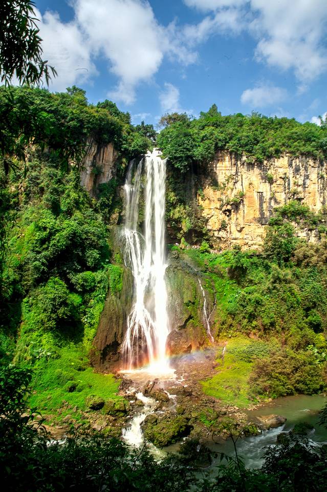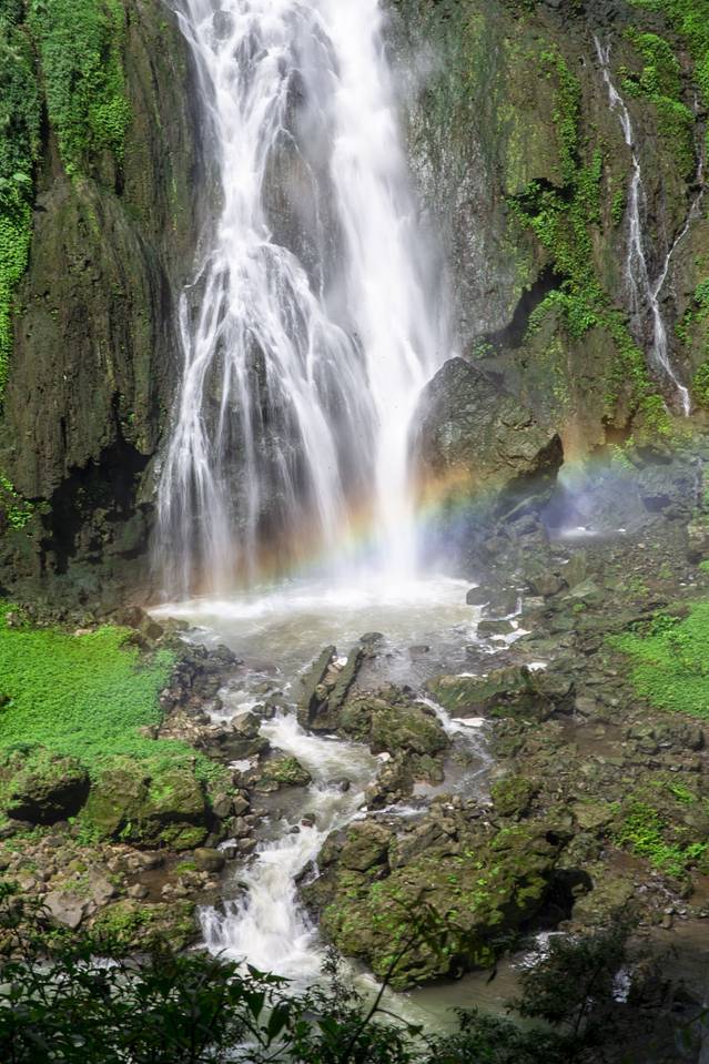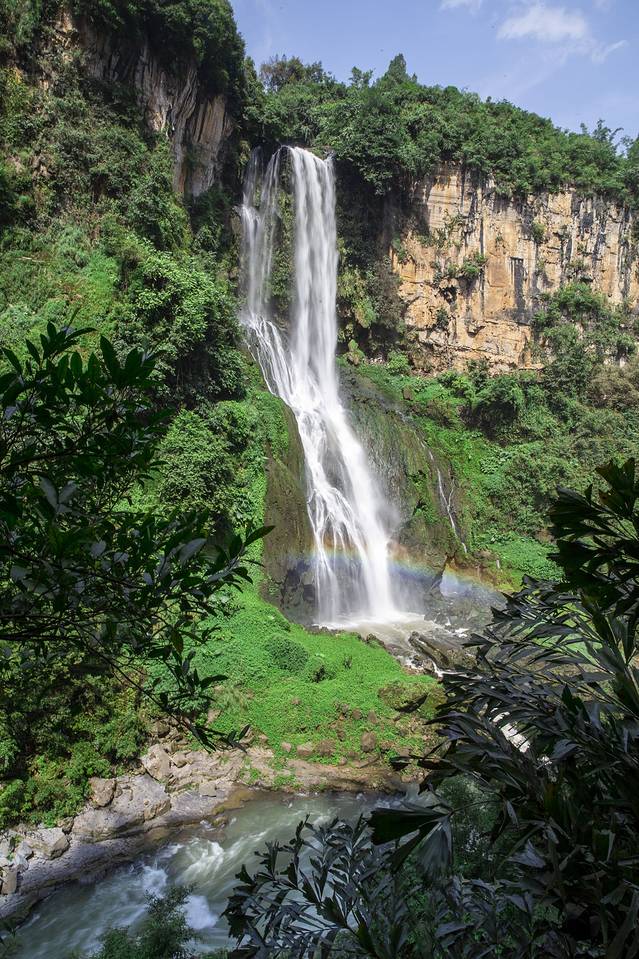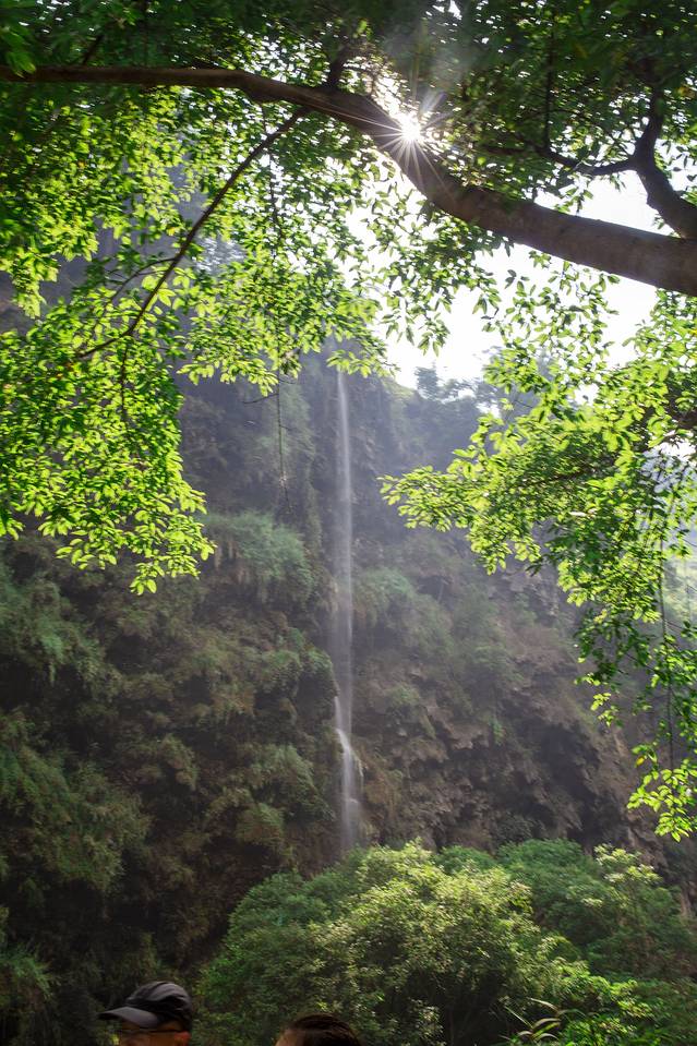 第一条大瀑布就是黄龙瀑布。百米高的瀑布从峰谷中垂直而下,气势磅礴。雨后初霁,水雾升腾,我们如愿地相遇了彩虹!