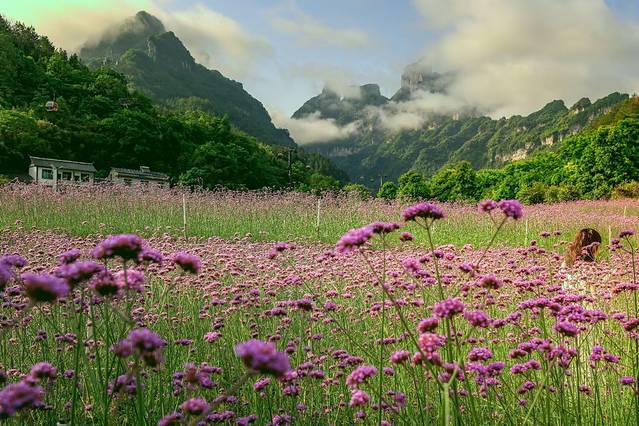 我们张家界天门山下的马鞭草花海:以巍峨挺拔的天门山为背景,借助梯田的层次,如梦似幻,也是美美的。