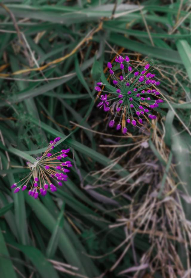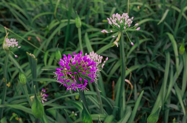 花头的颜色以紫色为主,也有白,有黄。这里的韭菜花花茎挺异类,不是圆的,而是多面片状的组织体,一种输送能力更扎实的样子。
