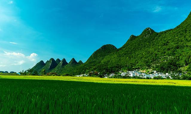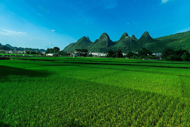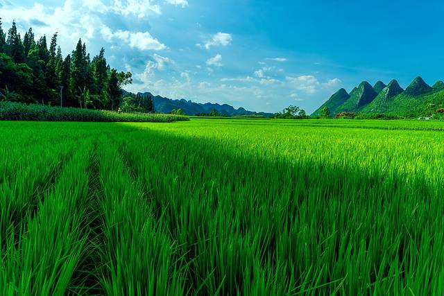 蓝莹莹的天空,呆萌萌的峰丛,绿油油的稻田,凉浸浸的遮荫,这景致美到让人窒息!万峰林的美,不仅仅在于它的奇峰异石,更在于它与田园风光的完美融合。