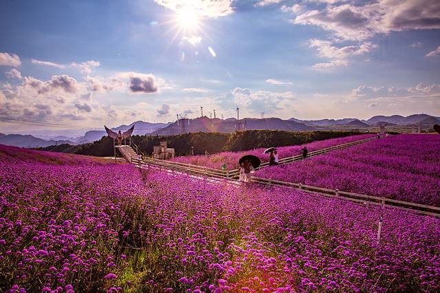 云顶花海精心选择在高海拔坡顶之上,栽植马鞭草300余亩,有地形的高差,有丰富的云层,不愧是“摄影的乐园”。能赶在夕阳西下时来赏花卉,这天的早起和长路,无疑是最值得的!
