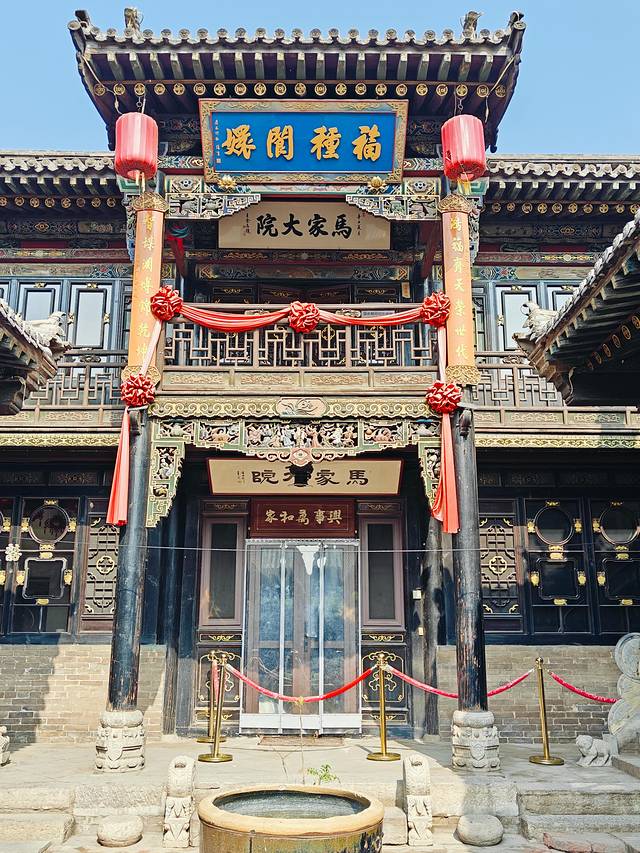 马家大院的大门楼,比乔家大院的门楼还要高大气派,有三层。马家大院,占地九亩之多,是平遥“四大富商”之首、清代巨商马中选的故居。始建于清同治年间,后经同治、光绪几十年的不断修建,逐渐形成了一座宏伟精美的建筑群体。共有3座大院、6座小院、房屋197间。大院总体布局鸟瞰酷似大大的“马”字形,以此告诫后代永不忘本,隐喻马家事业“马到成功、一日千里”之意。纵观全院,外观高大威严,四周皆清水砖墙,内部富丽精巧,井然有序,代表了我国封建大家庭的居住模式。夜晚一关门,俨然一个与世隔绝的“独立王国”。