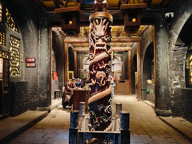 金库中央还有一根樟木雕刻的盘龙柱,传说是明初刘伯温重建平遥古城时安放的。它所在的位置正是平遥古城的正中心,因此又被称为“定海神针”,类似风水柱的作用。这根盘龙柱不仅是当时协同庆镇店之宝,更是整个平遥古城的镇城之宝。很多游客都喜欢到地下金库,摸摸这根龙柱转上一圈,沾沾财气。