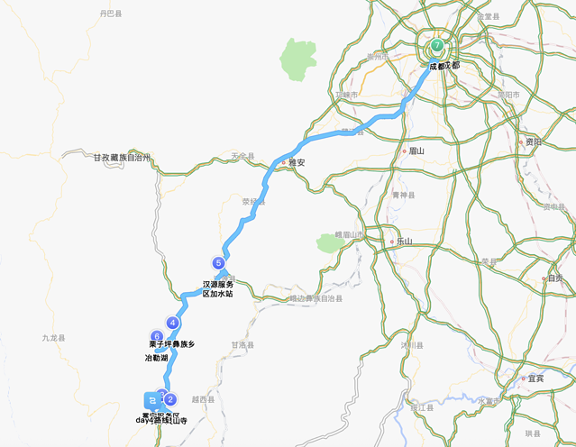 day4(里程550km):冕宁——灵山寺——栗子坪彝族乡(午餐)——冶勒湖——大渡河——成都(end)。