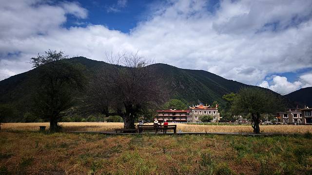 这里海拔约 3300 米,没有特别突出的标志性景观,却有着如诗如画的自然风光。道路两旁白杨林立,大概在10月下旬时,是十里长廊最漂亮的时候,金黄的树叶在阳光照耀下闪耀夺目。湛蓝的河水在路旁流淌,蜿蜒的小河、无垠的草原、连绵起伏的山峦构成了一幅美丽的画卷。藏寨散落其间,牦牛和羊群点缀其上,呈现出一派宁静而生动的田园牧歌景象。