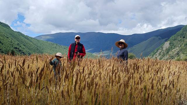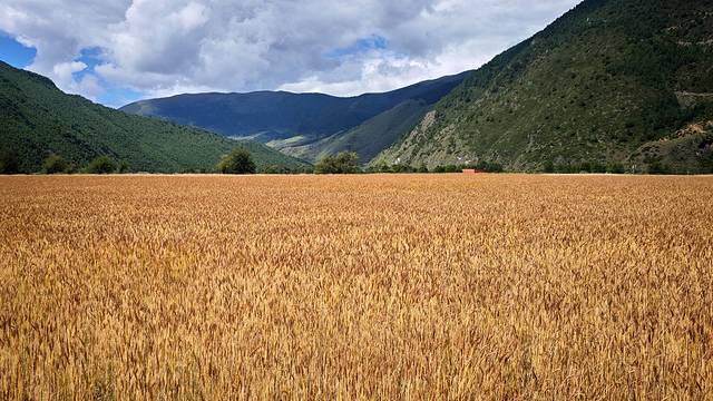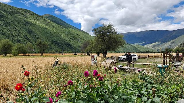 我们直接去的是甲根坝往下走一点的半亩青稞,这里在山谷上正好有一大片青稞,非常出片,里面有村里修的木质栈道,老人走也不累。当然,要说的是,这里进去每个人需要交2块钱,上厕所也要1块钱。对于这个事情,我认为还是可以接受的,毕竟村里维护这些设施还是有成本的。