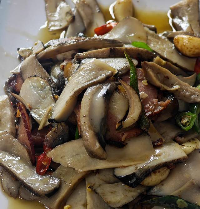 午餐,我们选择在沙德镇的沙九鱼庄吃的家常菜,算是这段路途比较有当地特色的餐馆了,大脚菇炒腊肉味道很不错,强推。这个蘑菇是当地山上采的,味道很不错。