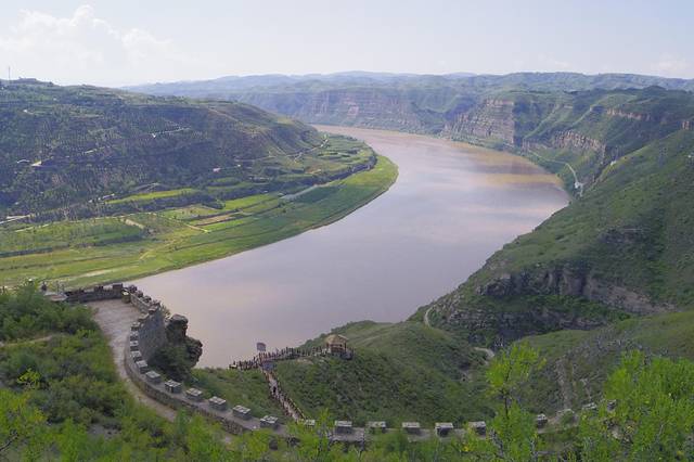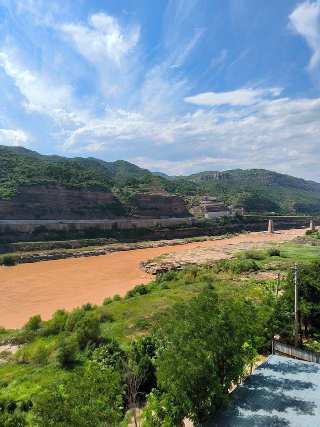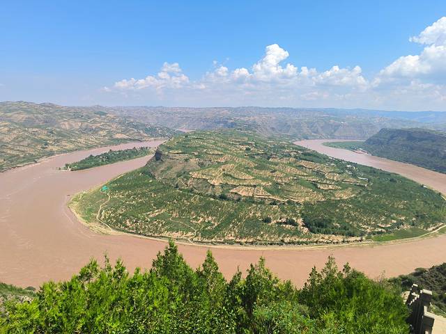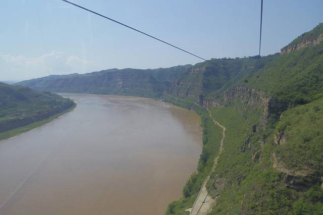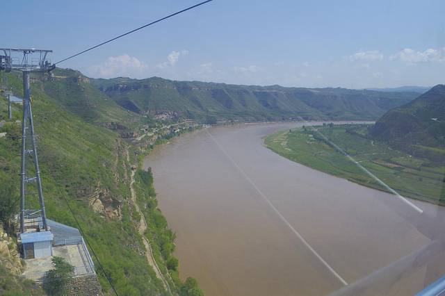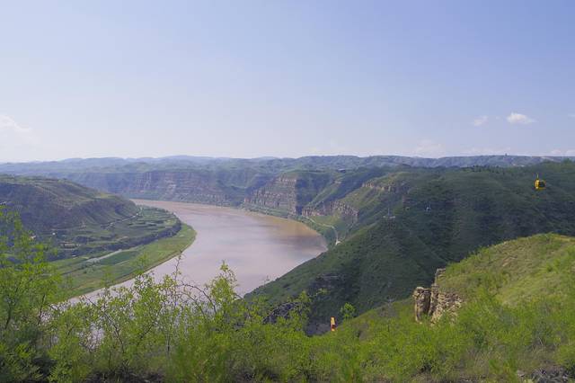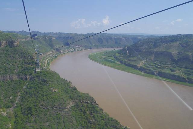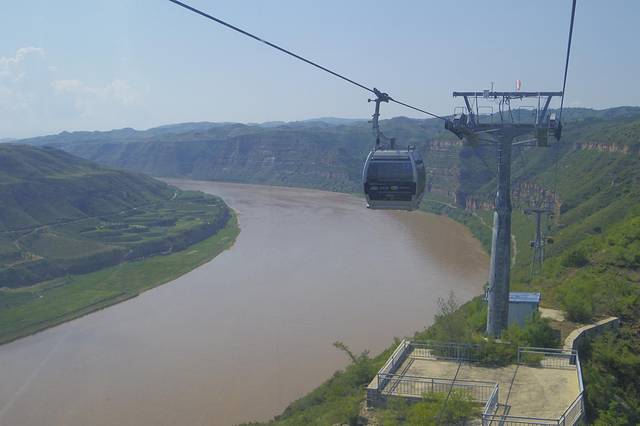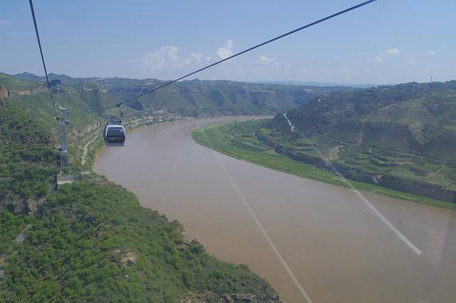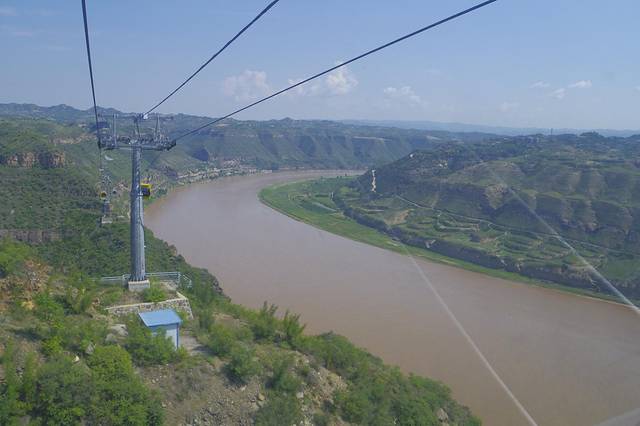 起初,缆车平稳上升,我能清晰地看到清水湾观景台上游客们如蚂蚁般渺小的身影,他们或驻足拍照,或凭栏远眺,沉浸在黄河湾那圆润饱满的305度大弯美景中。再远处,黄河水如一条蜿蜒的丝带,蜿蜒于黄土高原的沟壑之间,水流平缓,在阳光的折射下,闪烁着粼粼波光,与岸边古朴的村落、葱郁的植被相互映衬,勾勒出一幅宁静而祥和的山水画卷。