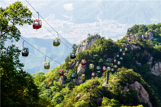 我选择乘坐上下两程索道上山,索道缓缓上升,窗外的景色如诗如画,连绵的山峦郁郁葱葱,宛如一幅展开的山水长卷 。