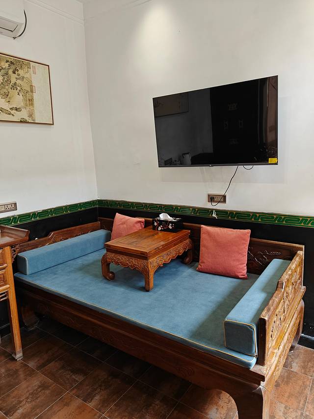 南书院客栈是三进式的明清古风院落,院子很大,布置也很适合拍古风写真,旁边有宽敞的公共区域,可以在这里聊天、下棋、看书,环境清幽,一步一景,晋商古院的氛围感十足,给人一种闹中取静的感觉。房间以土炕房为主,面积大,装饰古色古香。