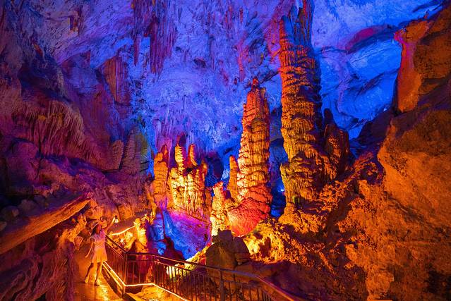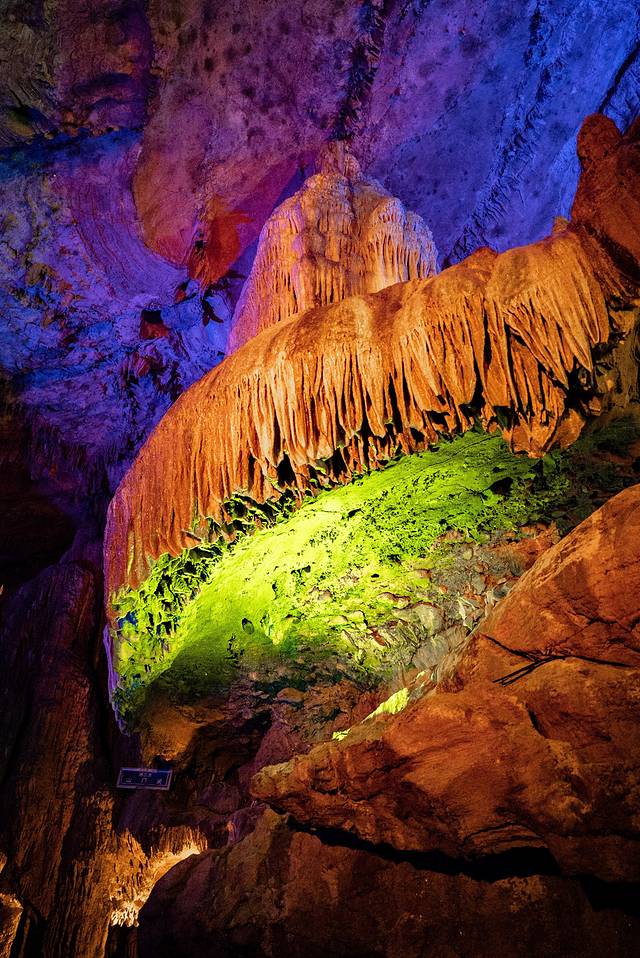 "一洞三游"的体验更是让人惊喜:上游1/3乘舟穿暗河,船夫撑着篙,小船在漆黑的河道里缓缓前行,灯光打在石钟乳上,折射出七彩的光芒。