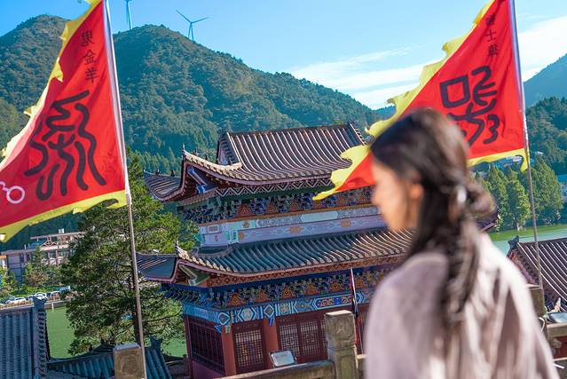 湖边的道教古建群便在山峦森林景中伫立,这便是九宫山的道教圣地,也是华中地区最完整的道教建筑群之一。