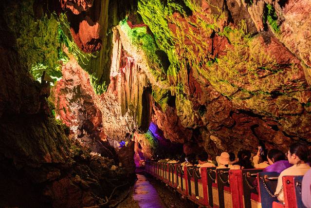 中游1/3坐小火车,穿越石幔长廊,头顶的钟乳石如帘幕垂落,有的细长如针,仿佛进入了水晶宫殿。