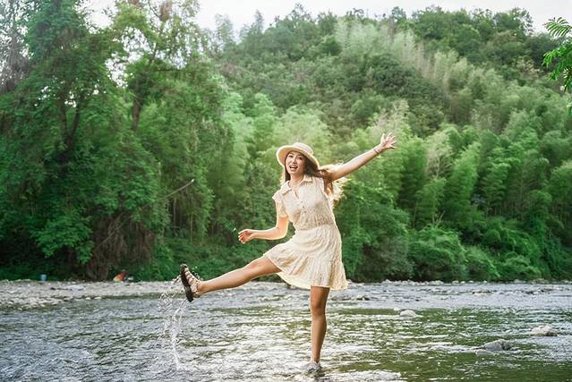 两岸的竹林和阔叶林枝繁叶茂,阳光透过枝叶形成斑驳的光影,落在水里,落在身上,像撒了一把碎钻。