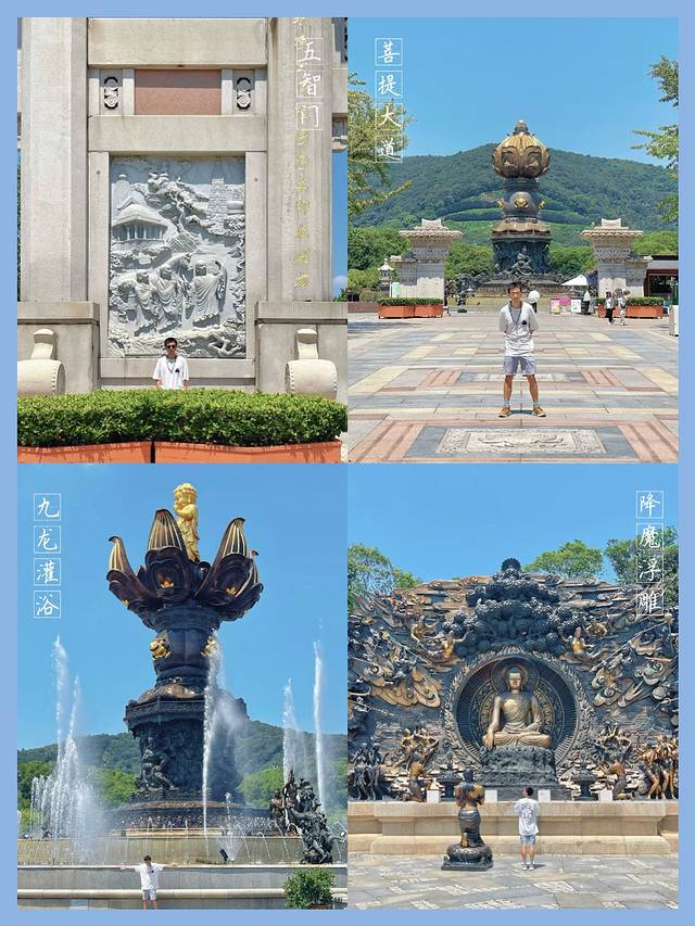 大照壁-五明桥-洗心池-佛足坛-五智门-菩提大道-九龙灌浴-降魔浮雕-阿育王柱-天下第一掌-百子弥勒佛-祥符禅寺-登云大道-灵山大佛-抱佛脚-灵山梵宫-曼飞龙塔-五印坛城