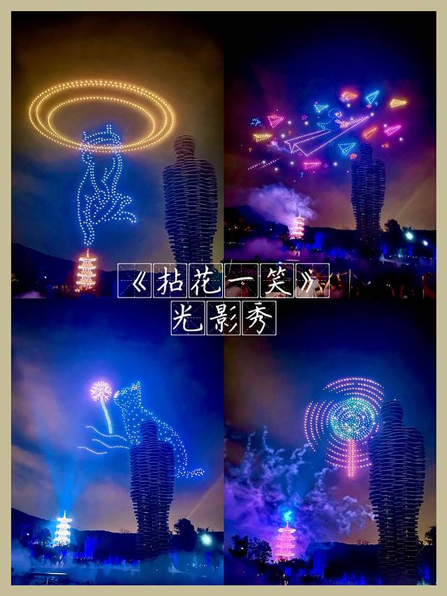 【拈花一笑】微笑广场的光影秀,蕞值得去的光影烟火无人机表演,天上光影变幻,古塔烟火绚烂,无人机超绝精彩。