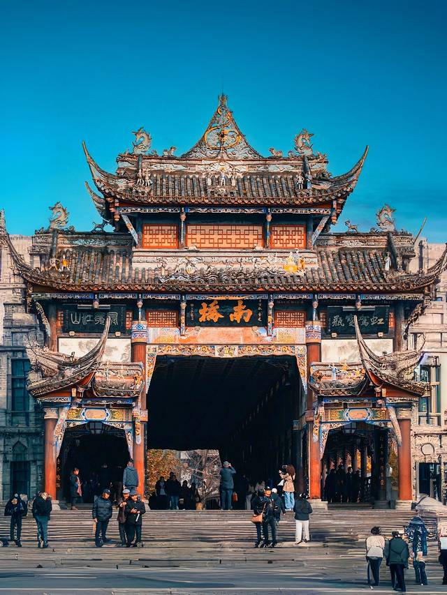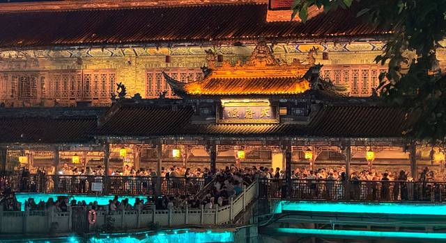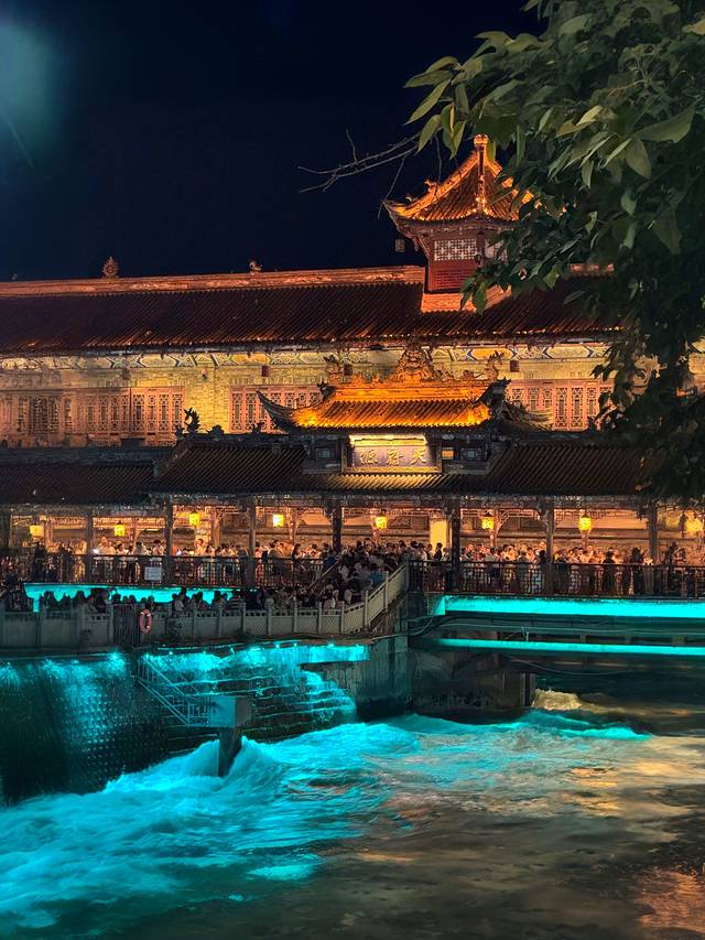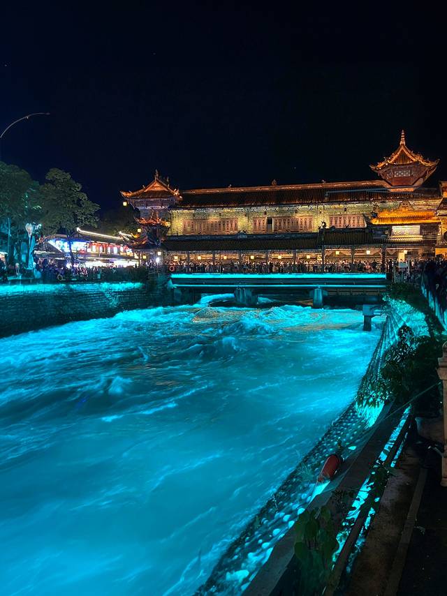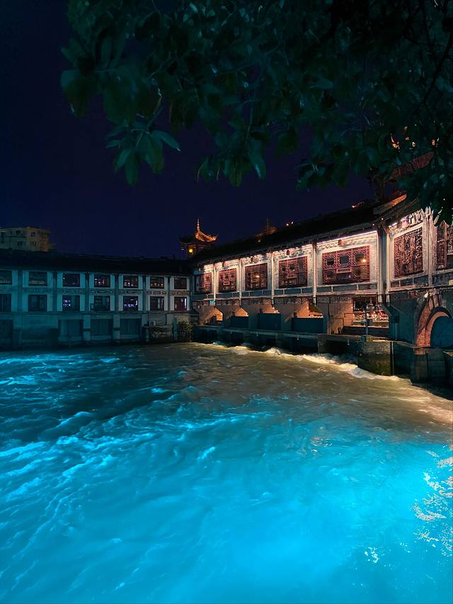 1. 南桥:这里是观赏蓝眼泪的经典位置。桥上和河道周围满是乘凉拍照的游人。宝瓶口旁青蓝色的灯光如梦如幻,使伏龙观似轻浮于江水之上。