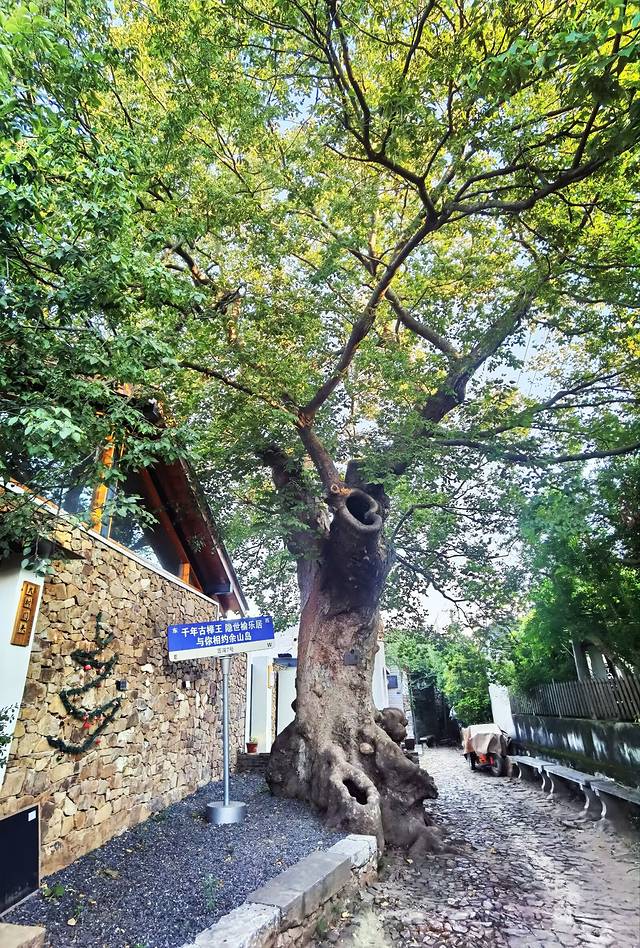 2、榉树。这棵榉树,坐落在西湾村,紧挨着一家名叫“大树门头”的民宿后门,细细一瞧,这棵树的躯干已是空心,但整棵树依然枝繁叶茂、遮天蔽日,煞是神奇!这棵树的树龄已有1018年,被称为“千年古榉王”,望着这棵千年古树,我想它一定见证了千年余山岛的世事沧桑,是一棵背后有故事的古树。
