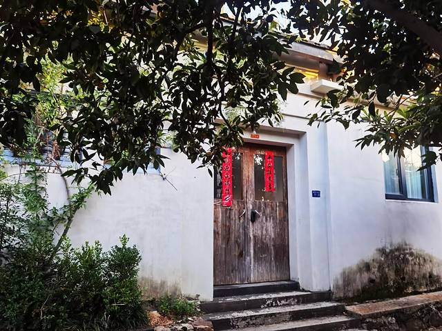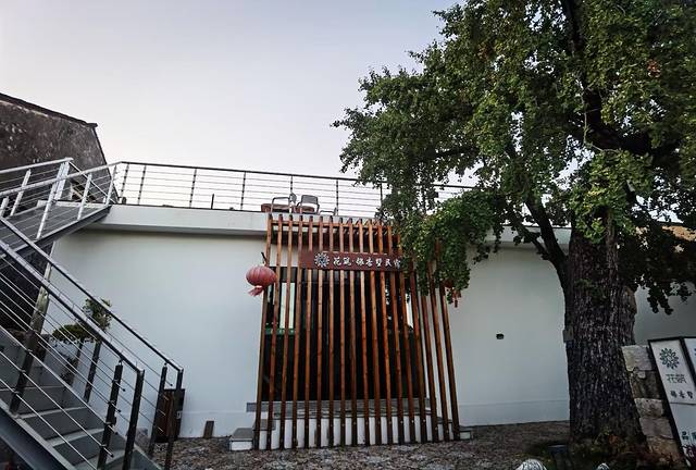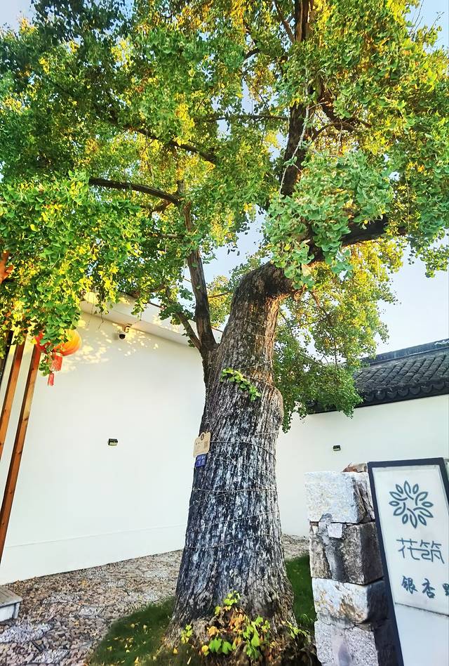 1、银杏树。这棵银杏树坐落在东湾村,树旁是一家名叫“银杏墅”的民宿,一树一家、相依相偎,画面很和谐,这棵树树龄已有818年,树杆粗壮高耸,树叶黄绿相间,有着一种威风凛凛兼具潇洒倜傥的视觉观感;银杏树一般都是成双成对的,但这里只有一棵,四处找了一遍,没找着另一棵。