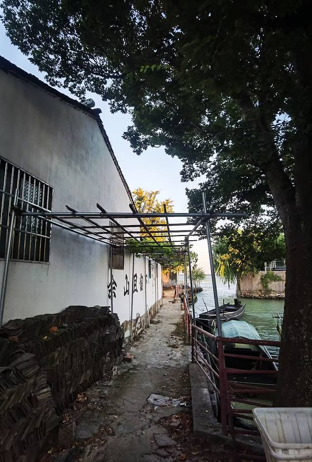 莫厘村白马庙码头有点不太好找,当跟着导航往东山方向开,经过“苏州小镰仓”看到东山宾馆后,这时候要注意了,再往前开一点点,有一条小路,小路一边有根灯柱,右拐进去就直达码头了;导航快要到达码头的时候,千万要放慢车速,否则很容易开过头,我们的两位老司机也不例外,统统地顺车掉头。如果在进入莫厘村白马庙码头的小路路口,竖一块引路标牌,那就一目了然,不会开过头了。
