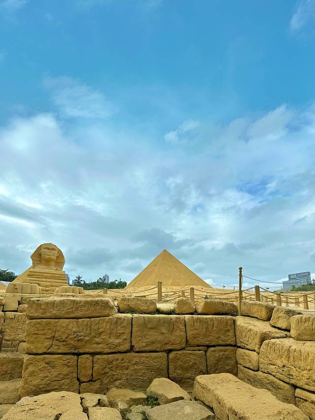 埃及金字塔与狮身人面像复刻景观,在蓝天映衬下尽显异域古老风情。